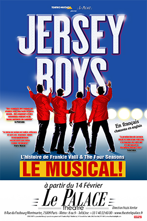 Du mardi 14 février 2017 au 30 avril 2017 inclus Jersey Boys ! L’histoire vraie de Frankie Valli and The Four Seasons, toujours à l’affiche à Broadway, débarque au Palace ! Spectacle en français.
